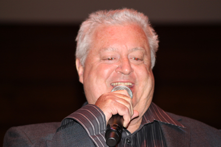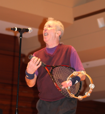Jim plays a mean air racquet when he's not lobbing tiny beach balls at the audience. |